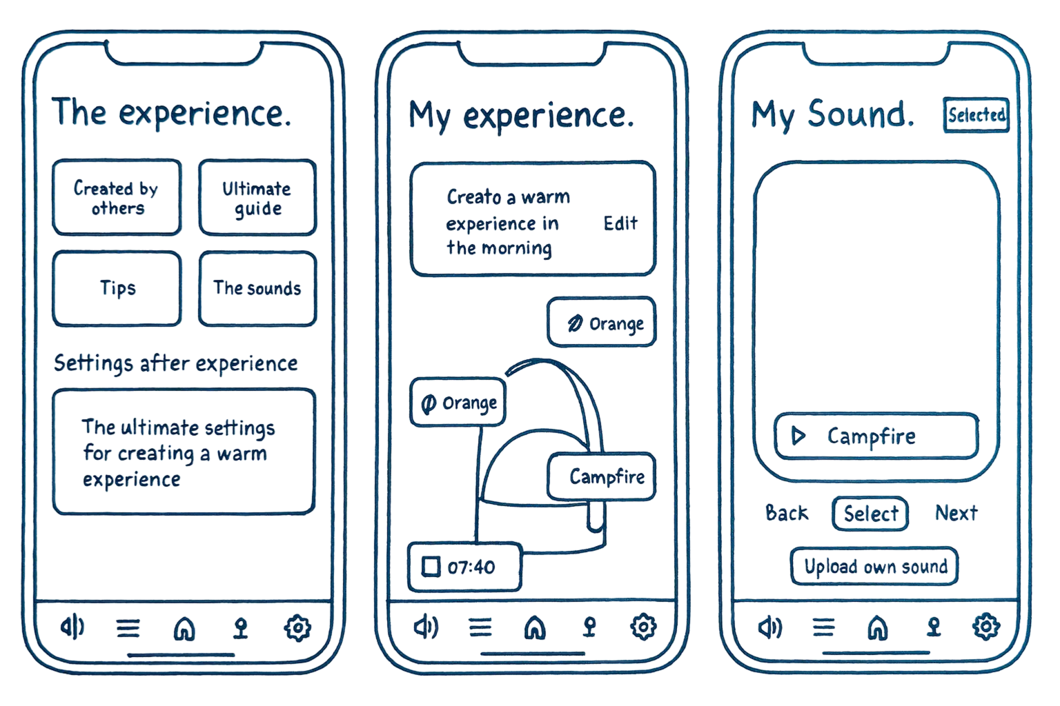 We also created low-fidelity sketches of the app’s UI to explore how the experience could be structured. Features like the alarm, smell, light, and personalisation.