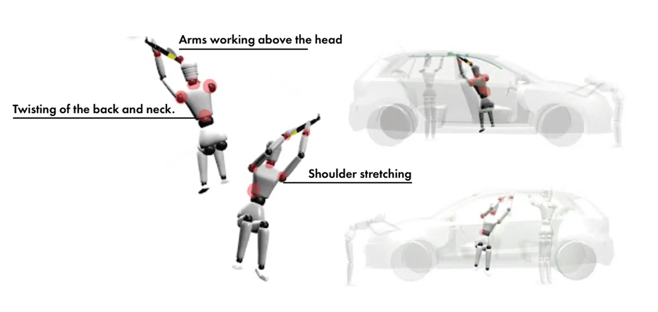 Our analysis showed that the current IC assembly process forces operators into strained and awkward positions. They often sit inside the vehicle, twist their neck and back to locate attachment points, and reach overhead to fasten screws.