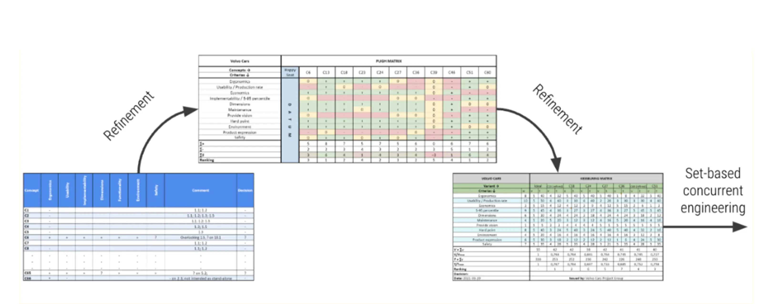 We evaluated the 66 concepts through a structured three-step process using an elimination matrix, Kesselring evaluation, and Pugh matrix. Concepts were assessed against Volvo’s key criteria—ergonomic improvement, production fit, 5–95 percentile compatibility, and cost feasibility.