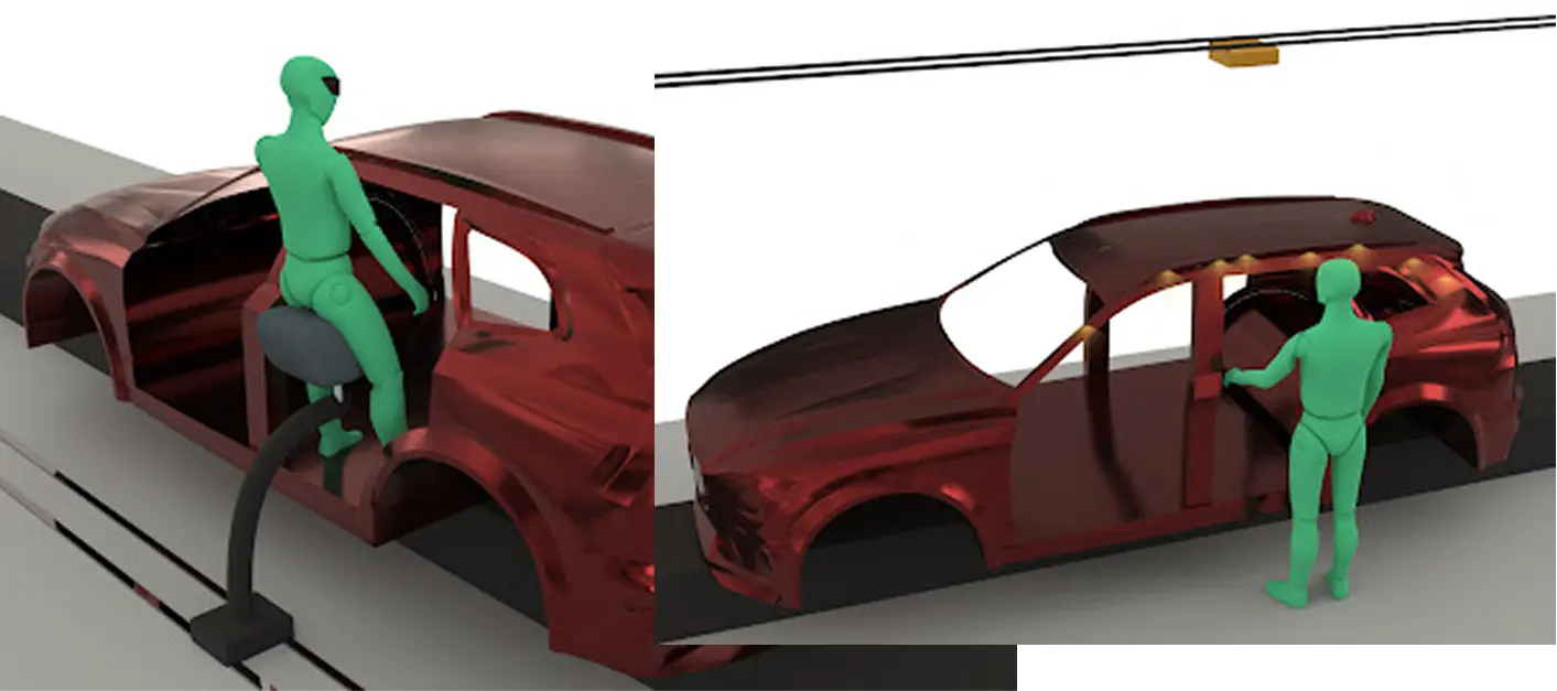 At Volvo’s Torslanda plant, the station for installing the inflatable curtain (IC) caused significant ergonomic strain. Operators often had to climb inside the vehicle, twist their bodies, and reach overhead to locate attachment points and fasten 8–11 screws.