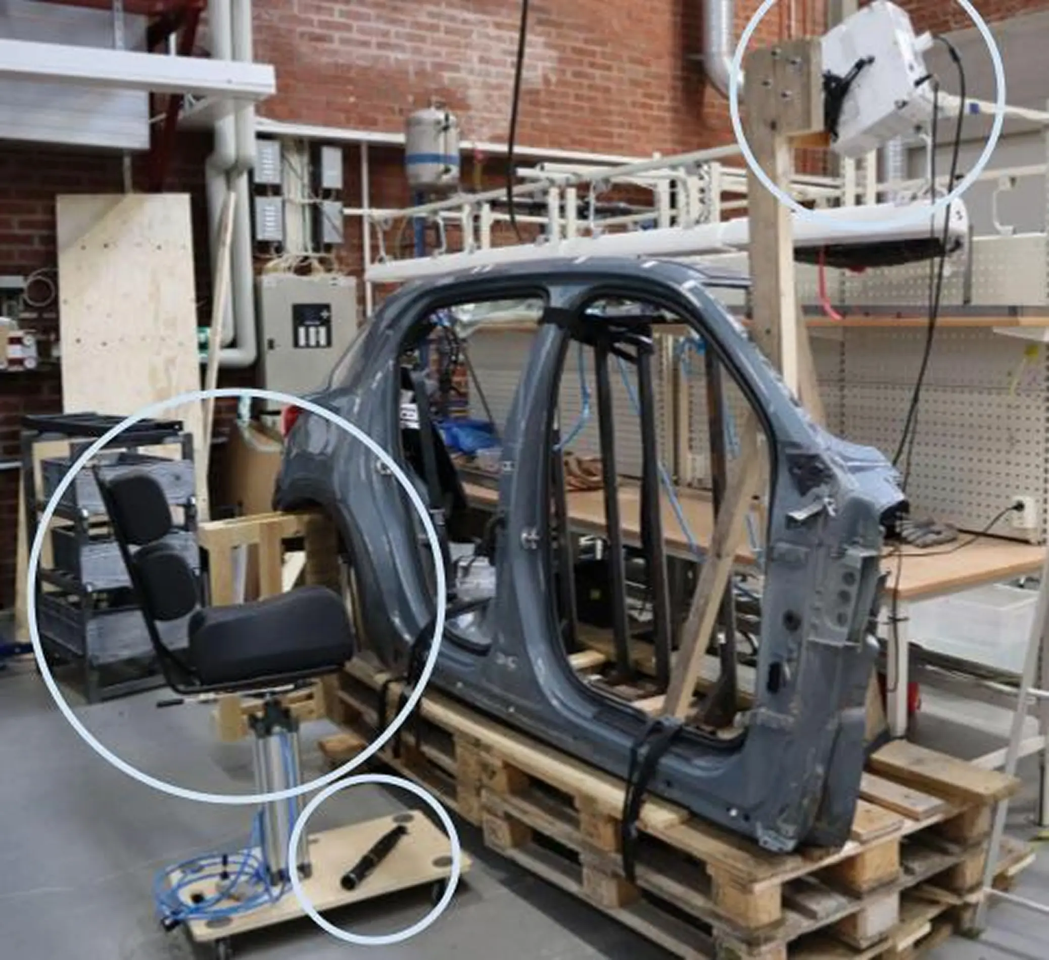 To validate the combined concept, we built a simplified prototype of the jockey seat and light projector and tested it using a Volvo XC40 side panel. The setup included a stationary light projector, a trolley-mounted jockey seat, and the standard assembly tools.