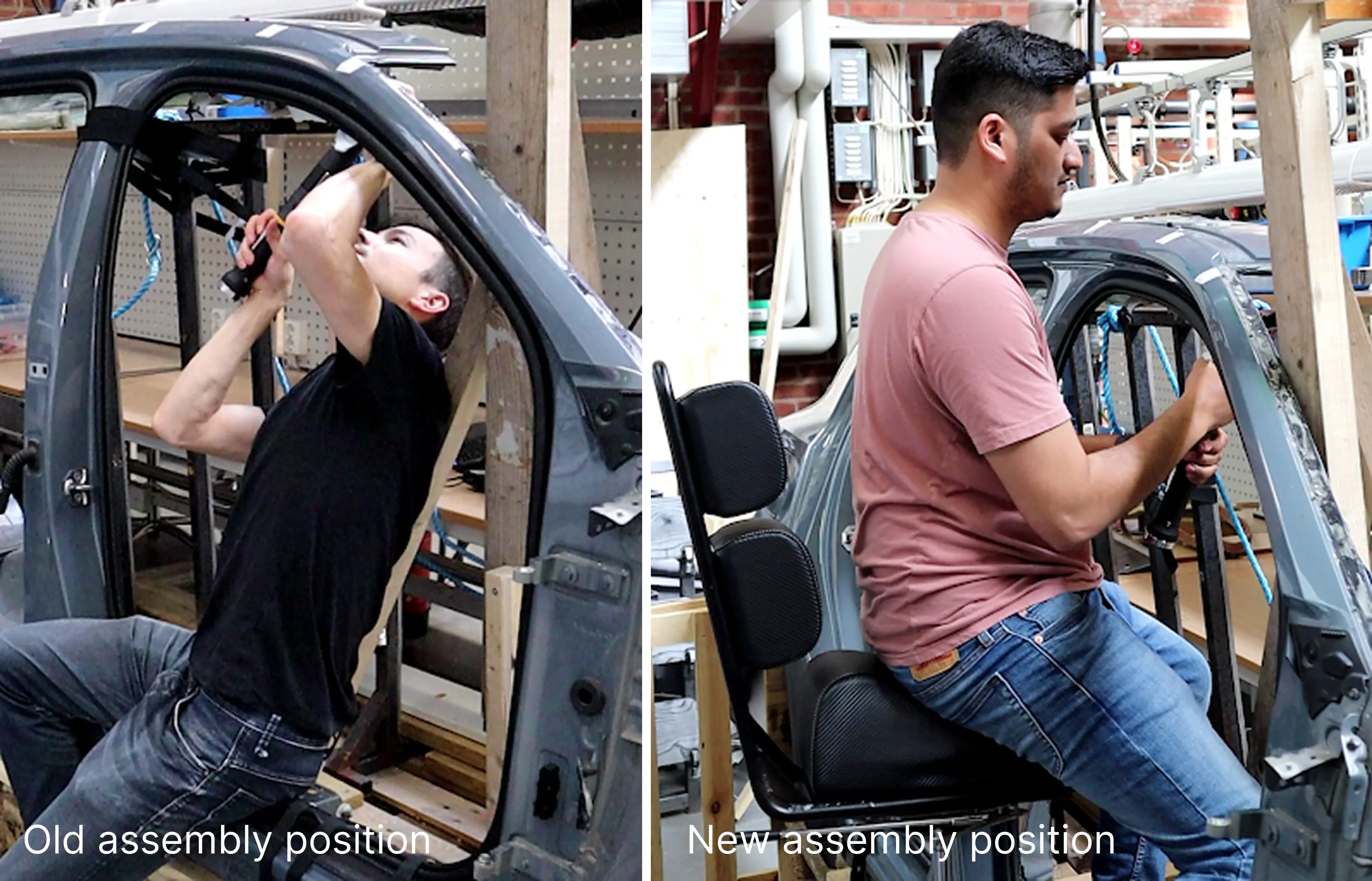 A redesigned assembly process supported by ergonomic guidance and positioning—enabling operators to work in a neutral, seated posture instead of climbing inside the car and reaching above shoulder height.
