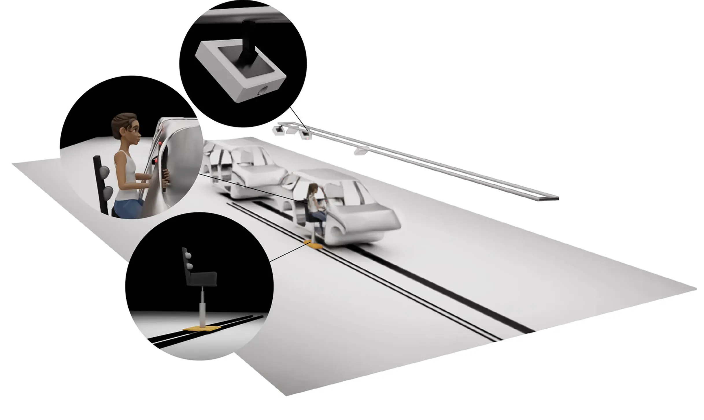 They travel on a ceiling-mounted rail, synchronized with the movement of the car. Once a vehicle exits the station, the projectors return to the starting point to meet the next one.