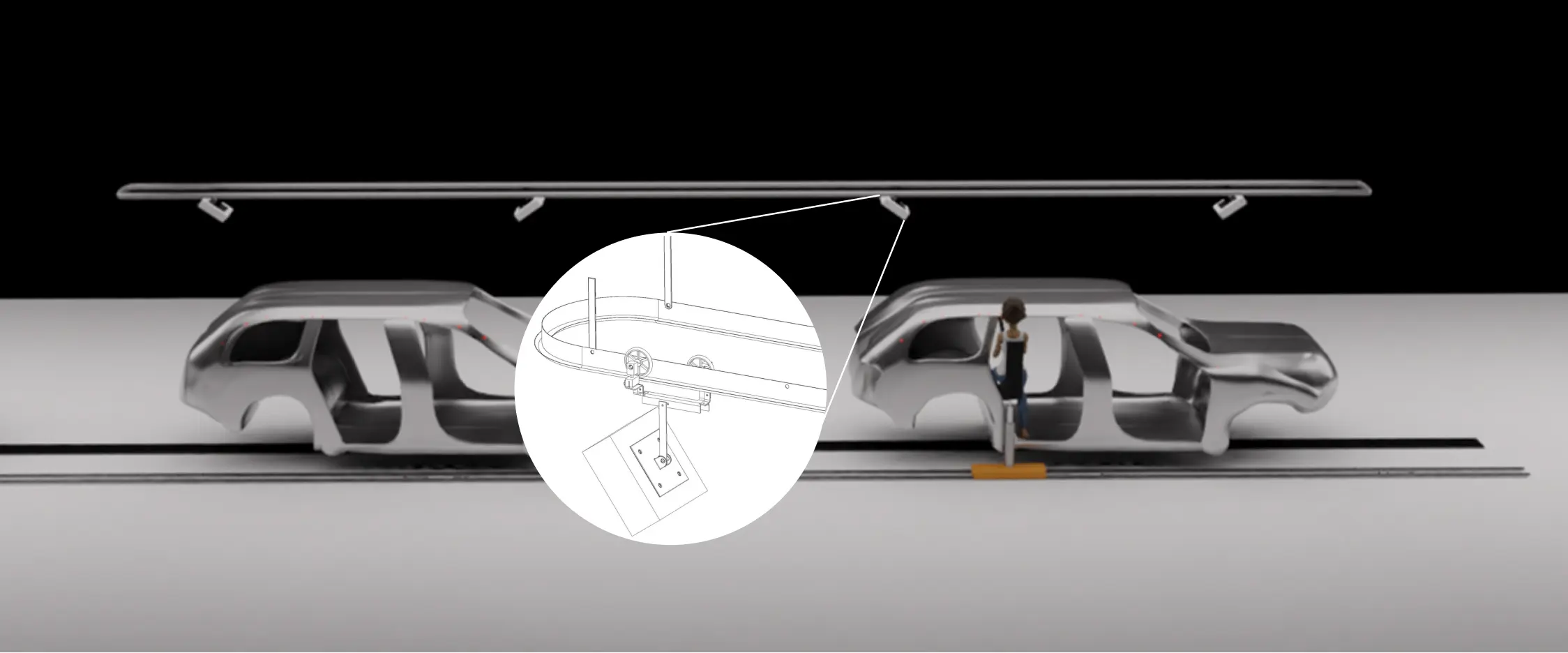 As each car enters the station, it is paired with two light projectors that move along the line and overlay the screw locations directly onto the roof surface. The operator performs the entire assembly while seated on a height-adjustable jockey seat that travels parallel to the car, keeping them in an optimal ergonomic position throughout the process.