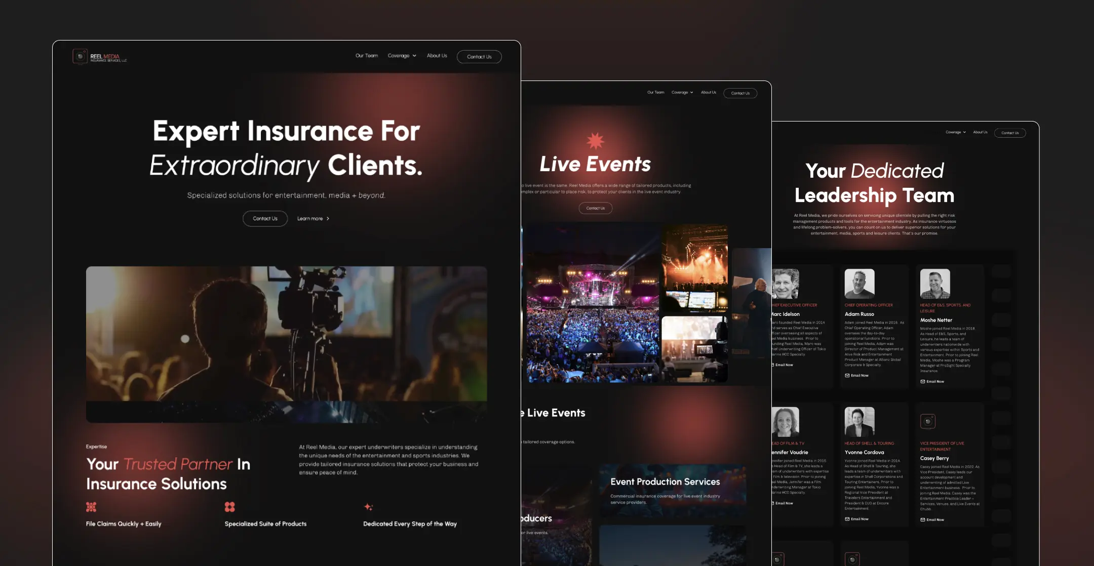 Reel Media is an insurance agency serving the entertainment industry, where trust and timely decisions are essential. The previous website did not reflect the people of Reel Media, the brand’s identity or their industry expertise.