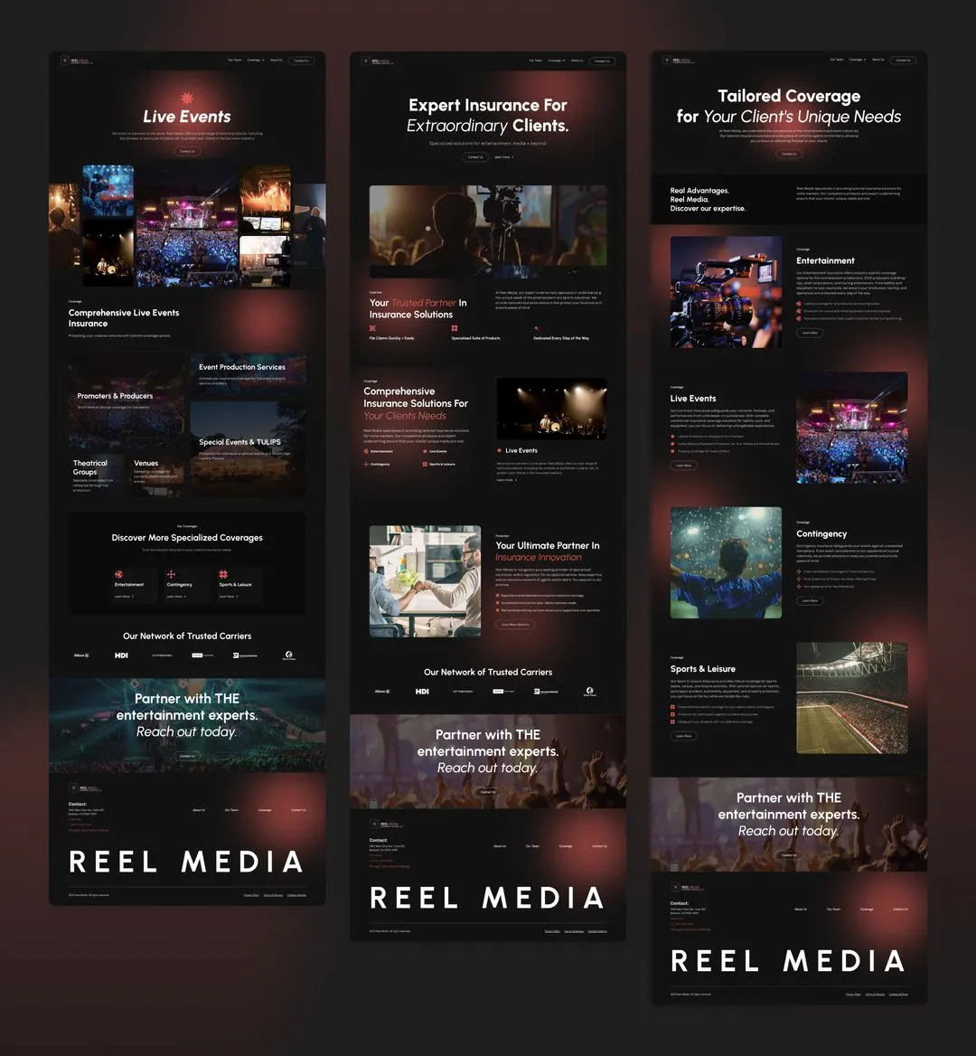 Reel Media helps entertainment clients find tailored insurance solutions. From stadium coverage to injury protection for athletes, they needed a site that reflects who they serve and how they work.