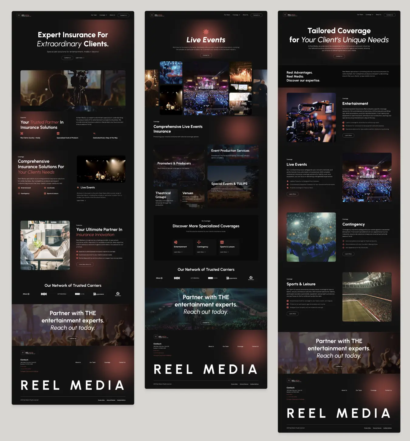 Reel Media is a digital insurance platform for the entertainment industry. I led the UX/UI design and Webflow build, translating complex insurance offerings into a clear, engaging, and conversion-focused experience. As the lead designer and Webflow developer, I handled everything from the early research and user flows to the visual identity, wireframes, and final site build. I took initiative in shaping the design direction and made all key design decisions throughout the project.