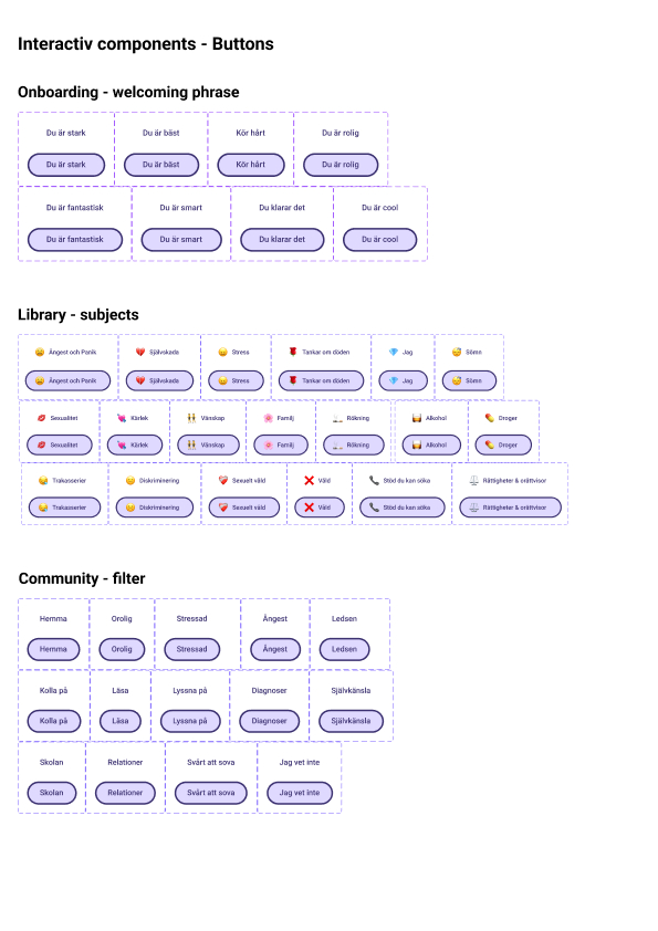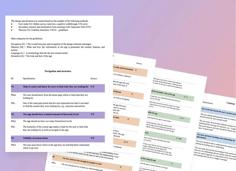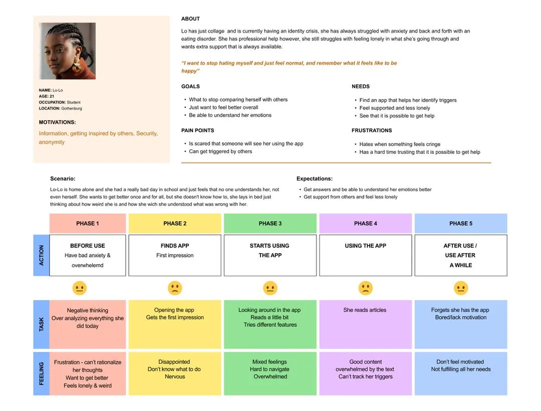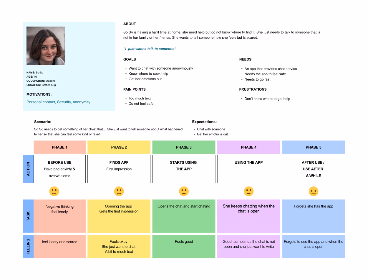 The main challenge was to improve the user experience and help Tjejjouren Väst understand why their app wasn’t being used. They needed deeper insight into their users' needs, behaviors, and motivations. My goal was to create clear design guidelines and a new interface that would actually support the people it was meant for — girls and young women aged 10 to 25. The app also had to feel safe, personal, and supportive in a wide range of situations, even in the most vulnerable moments.
