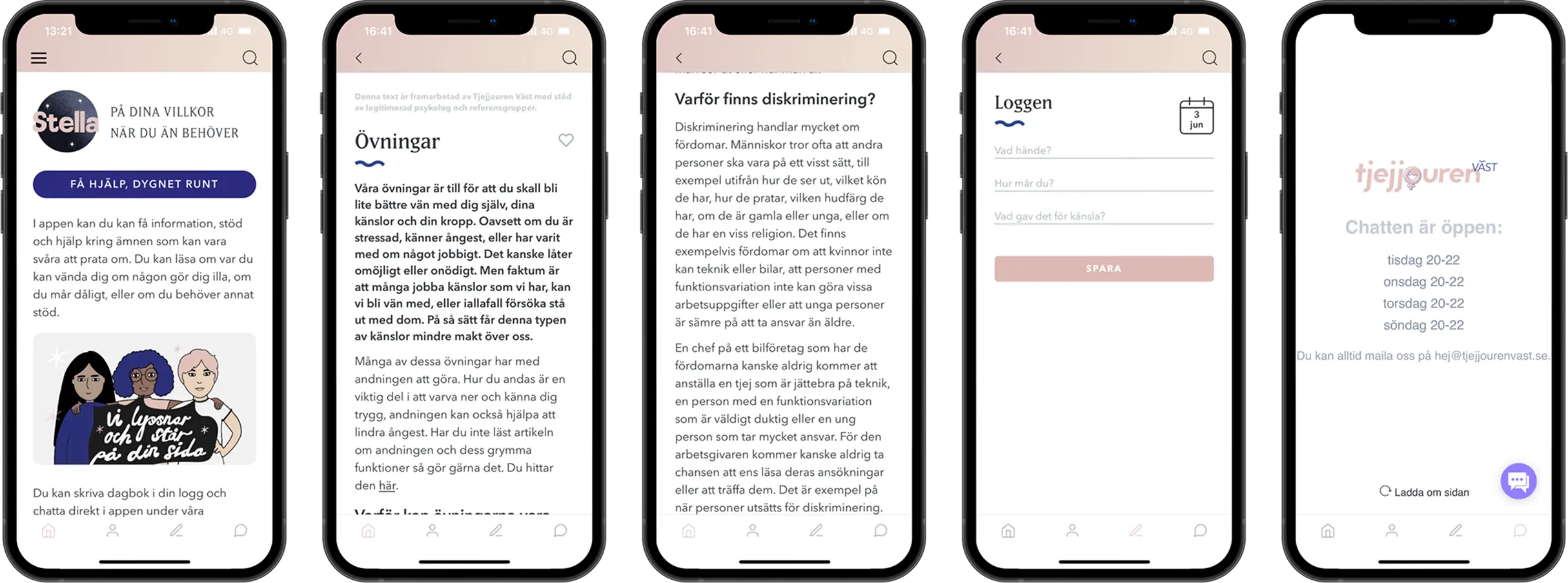 Tjejjouren Väst is a non-profit organisation that works to support and strengthen girls and young women. They offer online chat support with volunteers, through their website, and their self-help application - Stella.